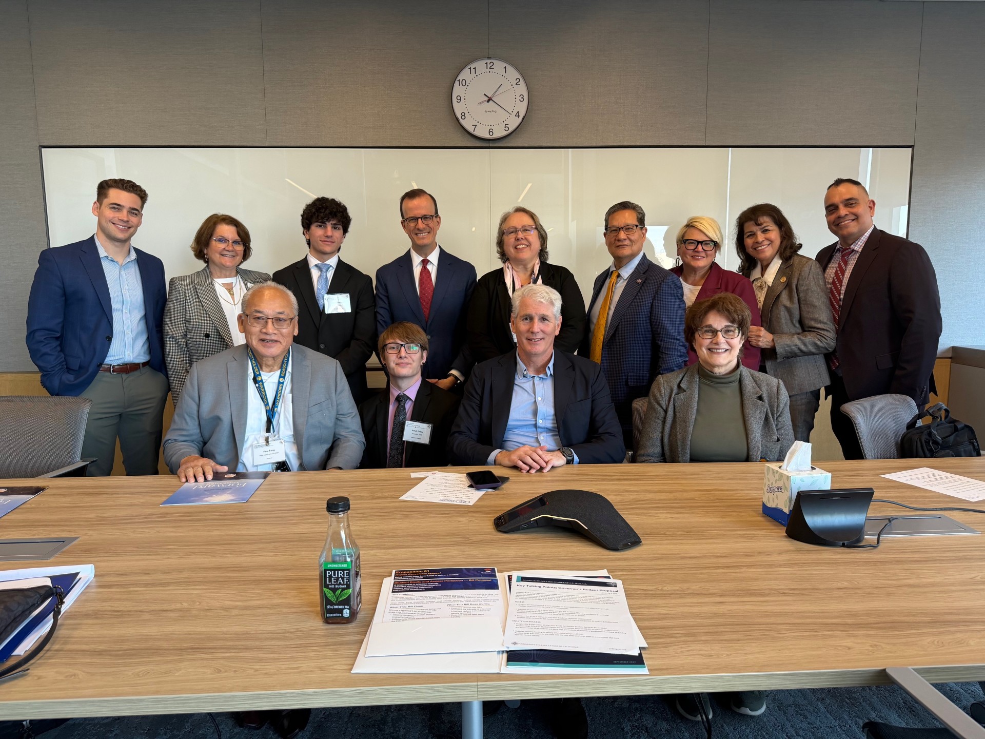 Above right: Foothill-De Anza Community College District staff, Assemblymember Marc Berman (center), and West Valley/Mission Community College District staff; above left: Assemblymember Patrick Ahrens (center, back) with staff from both community college districts